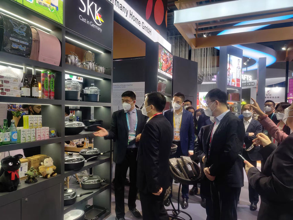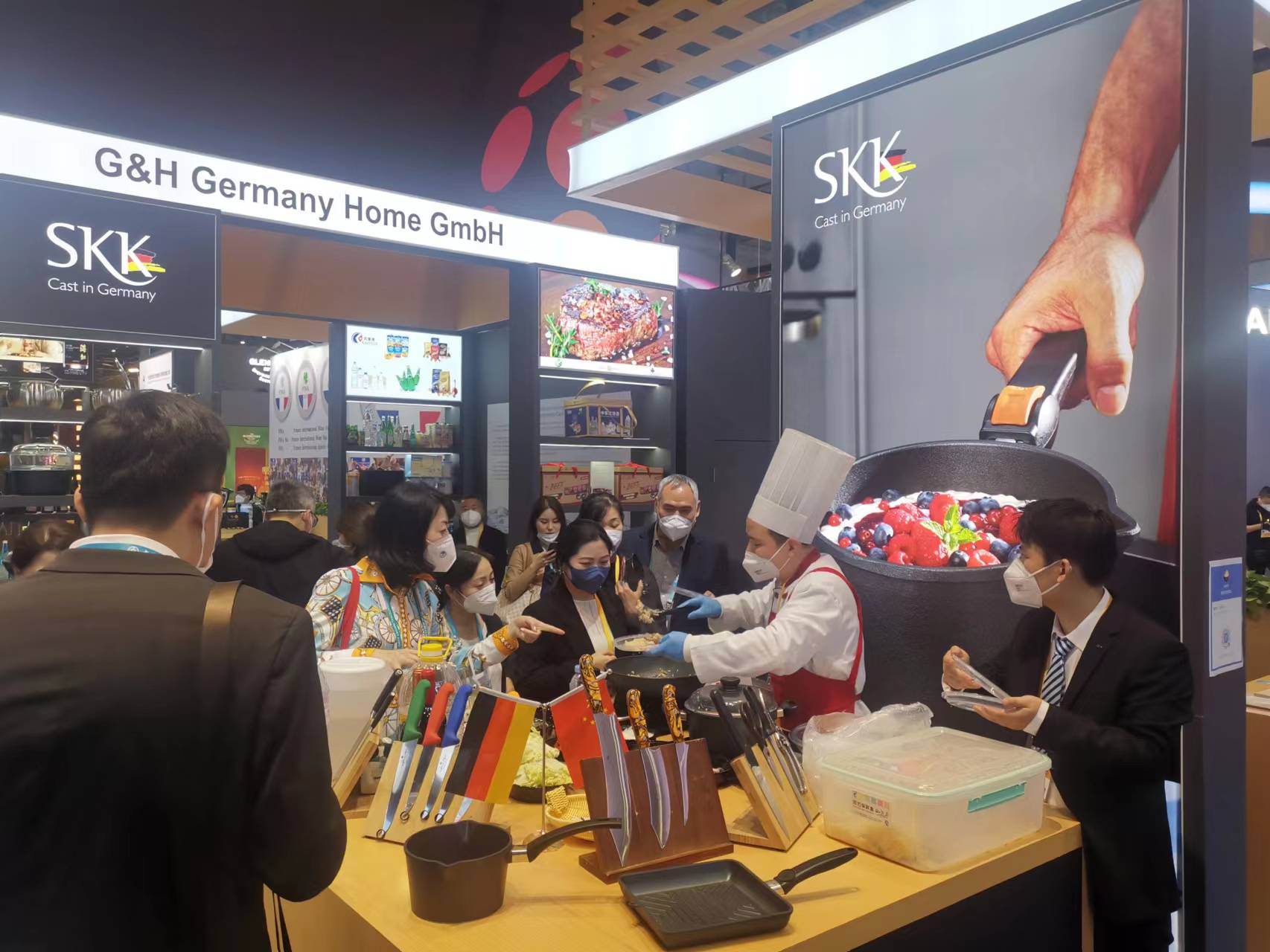 进博会1.2B2—04中厅德意志空间德国 SKK,5号,首场迎来了宁波市汤飞帆市长等一行参观德国skk以家庭生活方式展示的展区,展台上由来自西安市雁塔区的西安餐厅主厨现场使用德国SKK工匠传承的黑科技锅具烹饪,现场以8分钟时间烹饪羊肉手抓饭,营养时蔬牛奶餐,及3分钟现场烹饪长安德面美食,震撼观展人员对于德国SKK传承德国工匠黑科技带来的节能,低碳,绿色,营养,健康的好多个“不可思议”认知和感慨 !!!